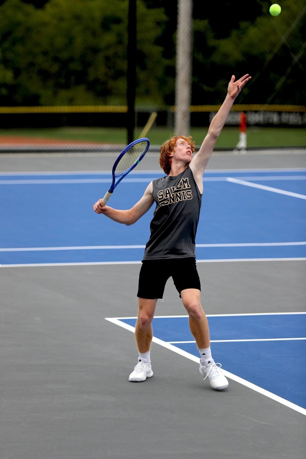 The 2025 boys tennis season came to an end at sectional The team had its best season in years with an 11-1 record. Here, junior Carson Albertson tosses the ball for a serve.